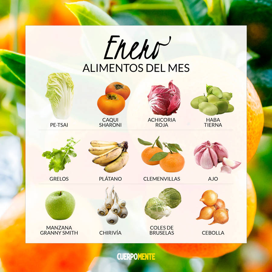 Enero Naranja, mandarina, kiwi, pomelo Acelga, col rizada, coliflor, br贸coli, alcachofas, cebolla, patata